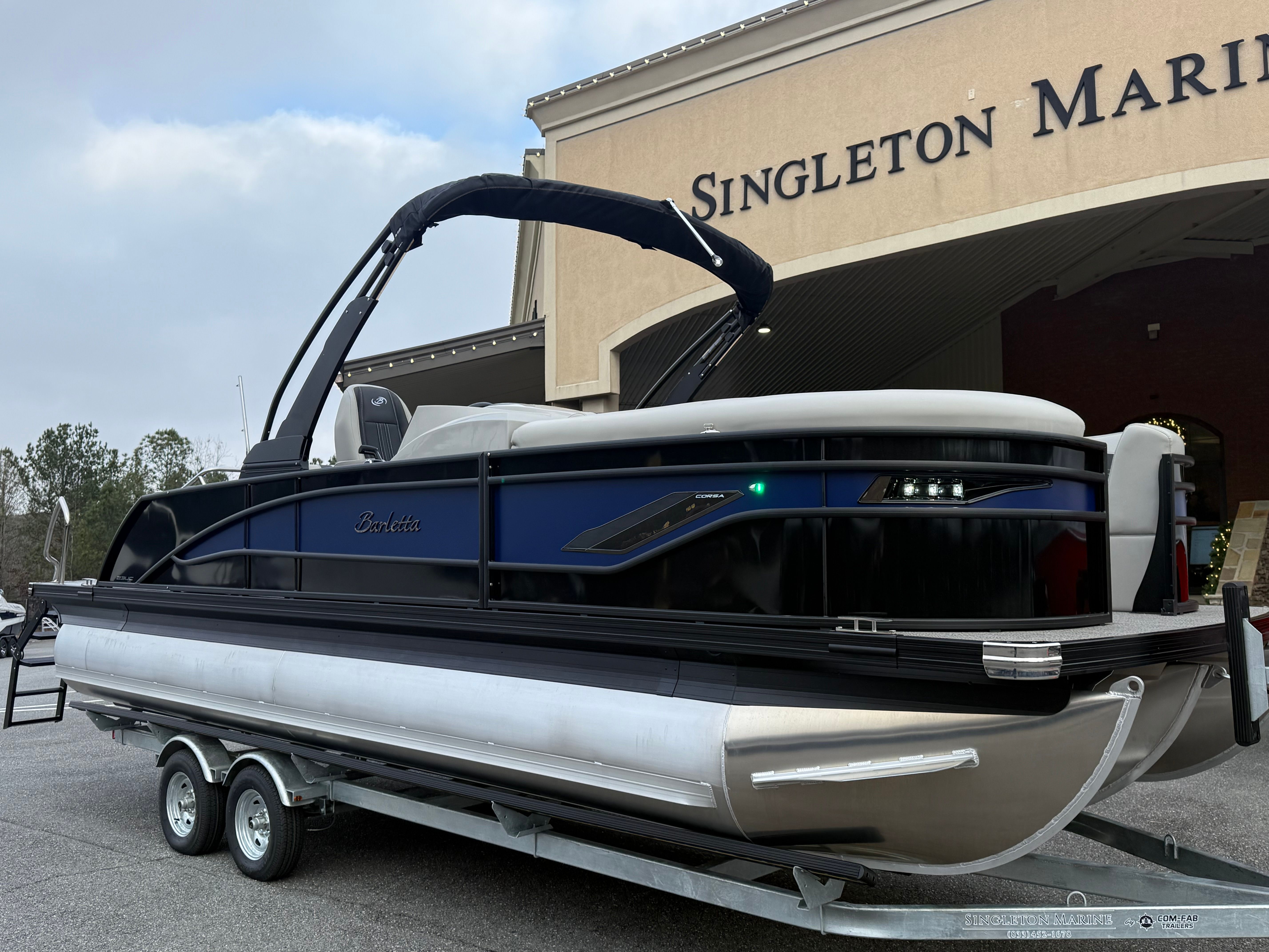 The 2026 Barletta Corsa 23UC is a 25-foot pontoon boat that stands out with its sleek profile and contemporary aesthetics. Built for both leisure and excitement, this Barletta boat for sale offers ample space for family and friends, making it the perfect vessel for social gatherings, weekend getaways, or tranquil cruises. The Corsa 23UC’s modern design is complemented by its striking Railskin Color in Black Diamond, accented with Bohemian Blue, and enhanced by the Blackout Package Corsa. Every detail of this pontoon boat is crafted to deliver a premium boating experience, from its stylish furniture to its advanced construction.